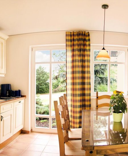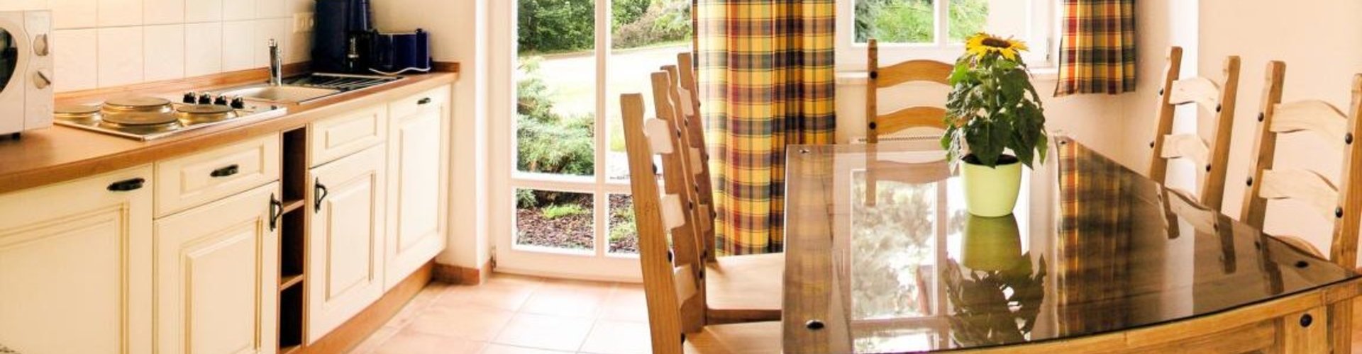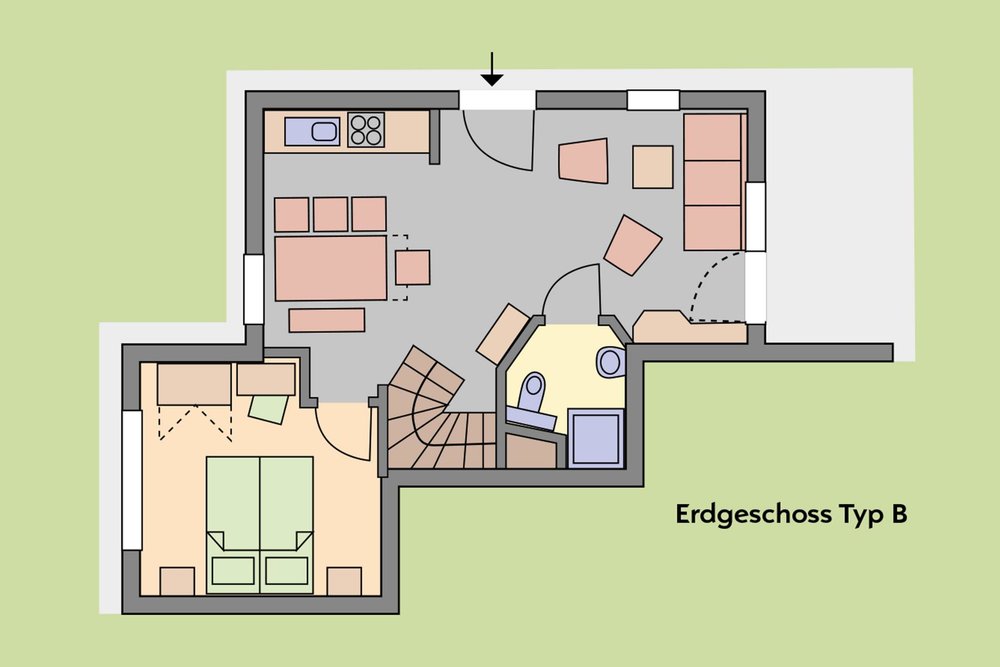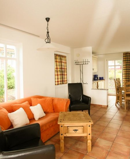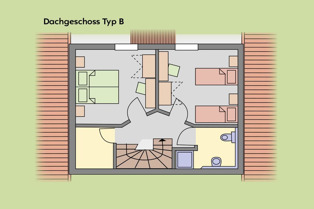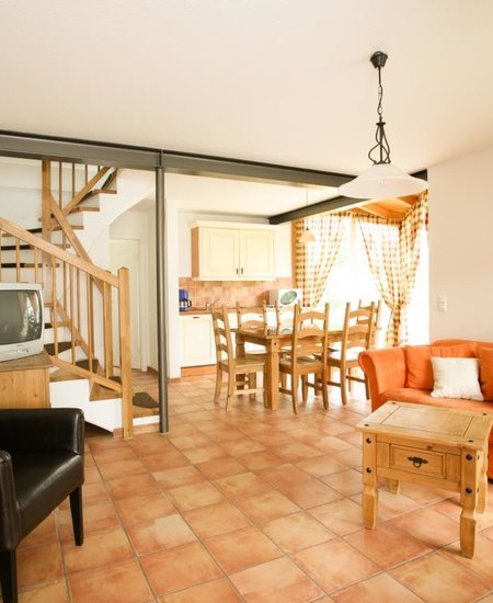 Reihenhaus ca. 90 bis 97 m², Wohnzimmer mit Doppelschlafcouch, Küchenzeile mit Geschirrspüler, drei Doppelschlafzimmer, zwei Duschbäder mit WC, HD-TV, Terrasse und Balkon. Geeignet für bis zu zehn Personen, davon mindestens vier Kinder oder ein bis zwei Kleinkinder. Im Dachgeschoss des Reihenhauses befindet sich eine Schlafempore mit zwei Matratzen, welche über eine Sprossenleiter zu erreichen
